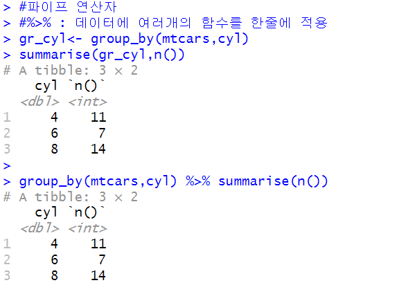 파이프연산자는 %>%의 형태로 사용하며 데이터에 여러개의 함수를 한줄에적용할 수 있도록 간편하게만들어주는 함수이다. 파이프연산자를 사용하지않았다면 첫번째 수행한 데이터의값을 변수에저장하고 저장된 변수명을 가지고 다시 새로운 함수에적용하여 넣어야 했다면, 파이프 연산자를사용하면 함수들을 한줄에나열한 후, 연결점에 파이프 연산자만 적어주면 된다.