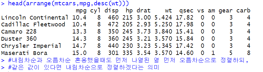 내링차순과 혼용하고싶다면 desc(열1)의 방법으로 내림차순과 함께 작성하면된다. 이렇게 2개이상의 열을 arrange안에 나열한경우, 나열된 첫번째 열의 옵션에맞게 먼저 오름차순 정렬되고, 만약 그안에서(mpg)안에서 동일값이 있다면 wt가 더 큰값으로 내림차순하겠다는 것이다.