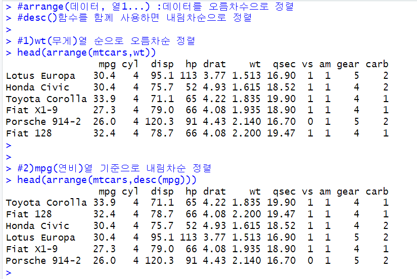 #arrange(데이터, 열1...) :데이터를 오름차수으로 정렬