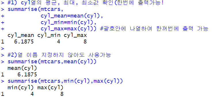 #1) cyl열의 평균, 최대, 최소값 확인(한번에 출력가능!