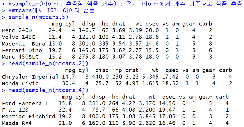 #sample_n(데이터, 추출할 샘플 개수) : 전체 데이터에서 개수 기준으로 샘플 추출
