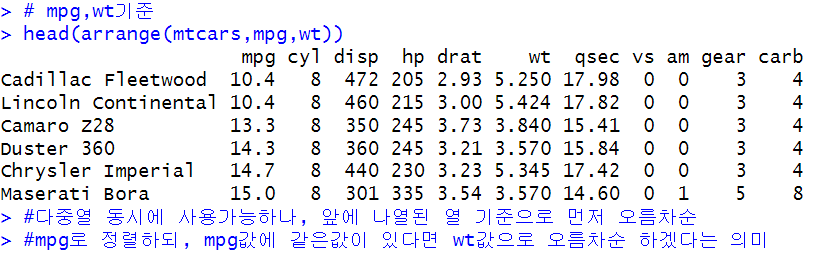 다중열을사용할때는 arrange(데이터, 열1,열2..)의형태로 사용하며,첫번째나열된 열부터기준으로 정렬하되 같은 값이 있다면 두번째 열 기준으로, 두번째 열에서도같은값이 있다면 세번째 열의 기준으로 정렬된다. 위 쿼리의 경우, 오름차순으로mtcars데이터를 mpg를 기준으로정렬하되, mpg에 같은값이있다면 그데이터는 wt가더 작은값으로 오름차순하여 정렬하라는뜻이다.
