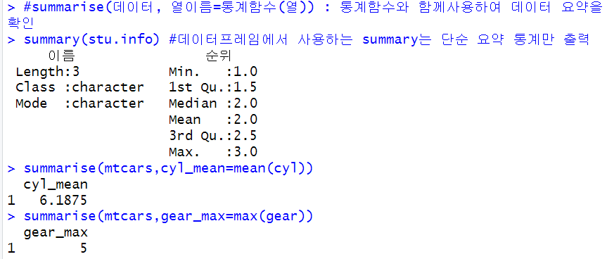 #summarise(데이터, 열이름=통계함수(열)) : 통계함수와 함께사용하여 데이터 요약을 확인