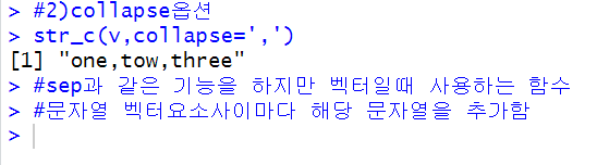 collapse()는 sep과 같은 기능을 하지만 연결되는 문자열이 벡터일때 사용하는 옵션이다. 문자열 벡터 요소사이마다 해당 문자열을 추가하여준다.