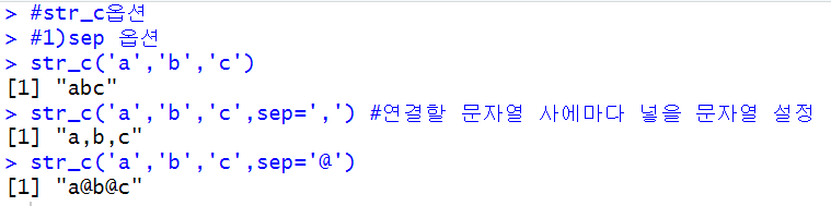 str_c에서 sep옵션은 문자열들을 연결해줄때 문자열들의 사이에 넣을 문자열을 지정해줄수 있는 옵션이다. str_c(문자열1, 문자열2,sep='사이에 넣을 문자열')의 형태로 적는다.