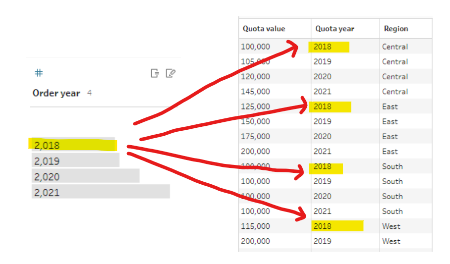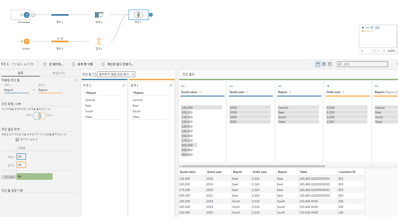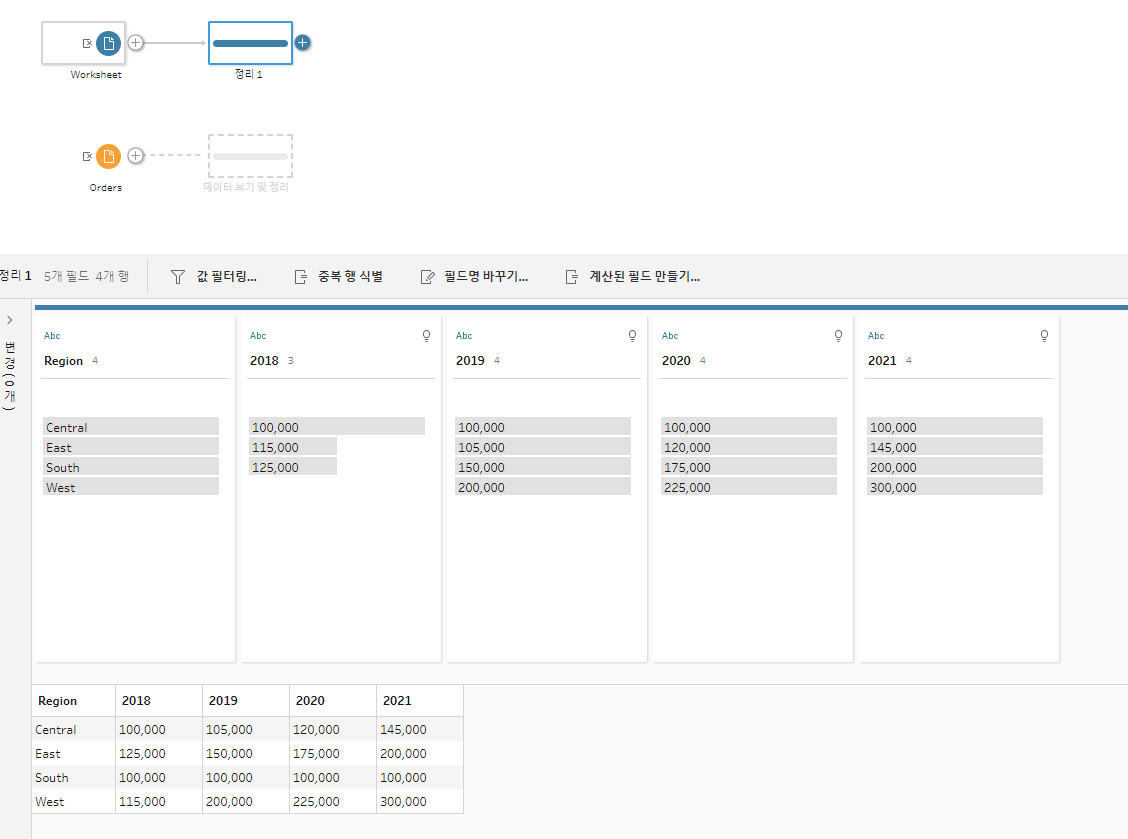 태블로에서 집계작업에 사용할 데이터를 로드해준다. 오늘 사용할 데이터는 지역별, 년도별 할당량이 저장되어있는 Quota테이블과고객ID, 판매량 등, 주문에 대한 정보가 구체적으로 담겨있는 Oders데이터를 사용할 예정이다. 오늘 이 두데이터를 가지고 공통적으로 존재하는 년도와 지역을 그룹화한 후, 조인하여 년도, 국가별 전체 판매량과 그에대한 고객수를 한 테이블로 정리하여 추출할 예정이다.