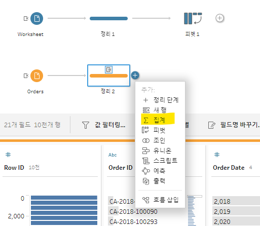 데이터 집계를 하기위해서는 집계하고자 하는 데이터에서 +버튼을 누른 후 집계를 누르면