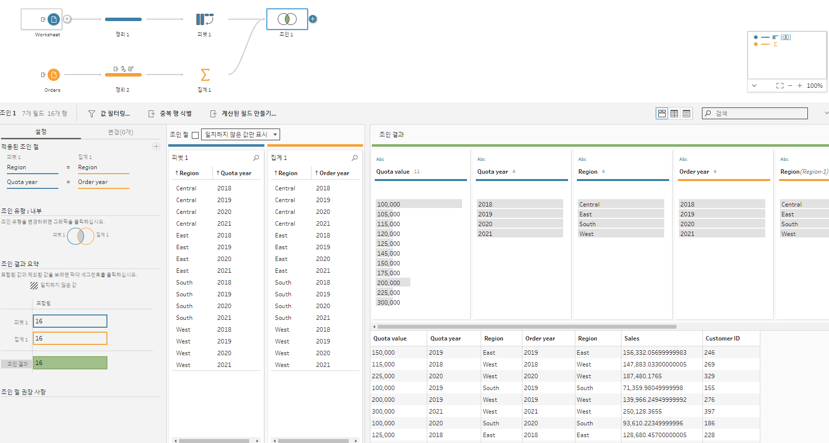 이렇게 문제 없이 조인이 성공적으로 된것을 확인할 수 있다. 우측하단의 데이터를 보면 목표했던 대로 지역 년도별 판매량의 합계와 고객수가 출력된것을 확인할 수 있다.