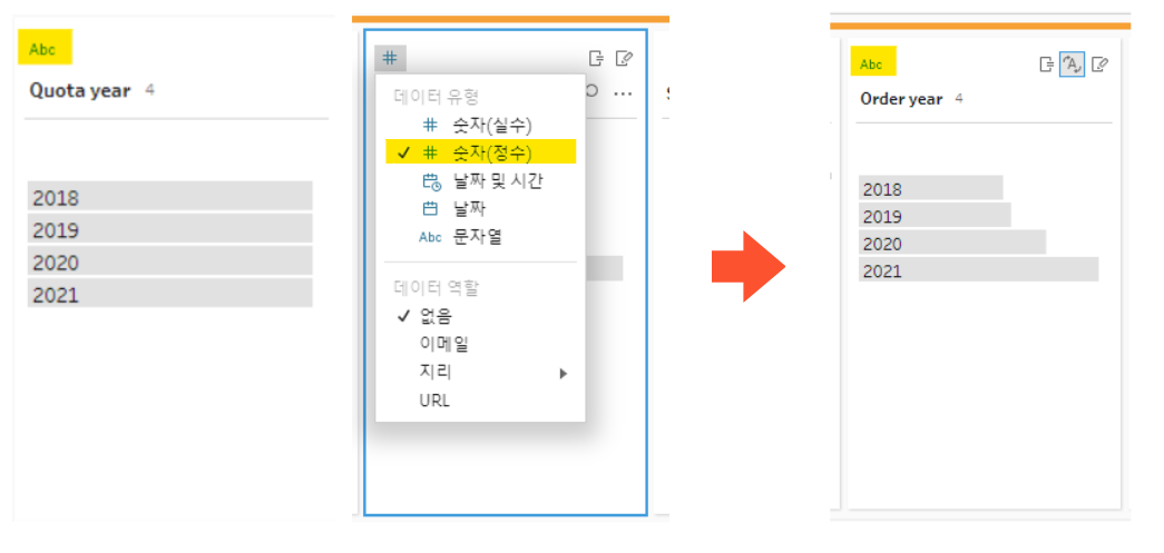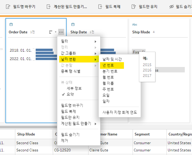 그런 다음, Oders테이블의 년도를 살펴보면 Quata테이블과 다르게 날짜 데이터가 년월일로 이루어져 있다는것을 알수있다. Qouta테이블은 년도로만 이루어져있기때문에 이 둘을 조인하려면 Oders테이블의 년월일에서 년도만 추출해야한다. 날짜변환 탭에서 년 번호를 클릭하면 오른쪽 이미지처럼 Oders Date가 년도만 추출된것을 확인할 수 있다. 이제 이 필드의 이름을 헷갈리지 않도록 year로 바꿔주도록 하자.