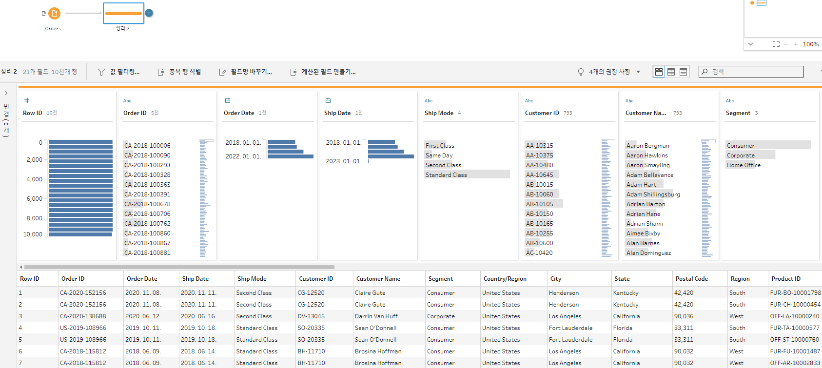 예정했던 목표에 맞춰 먼저, 년도와 지역을 그룹화해준 후, 판매데이터를 sum해주고 고객수를 알기위해 고객ID를 고유값만count해주는 CNTD로 설정해준다.