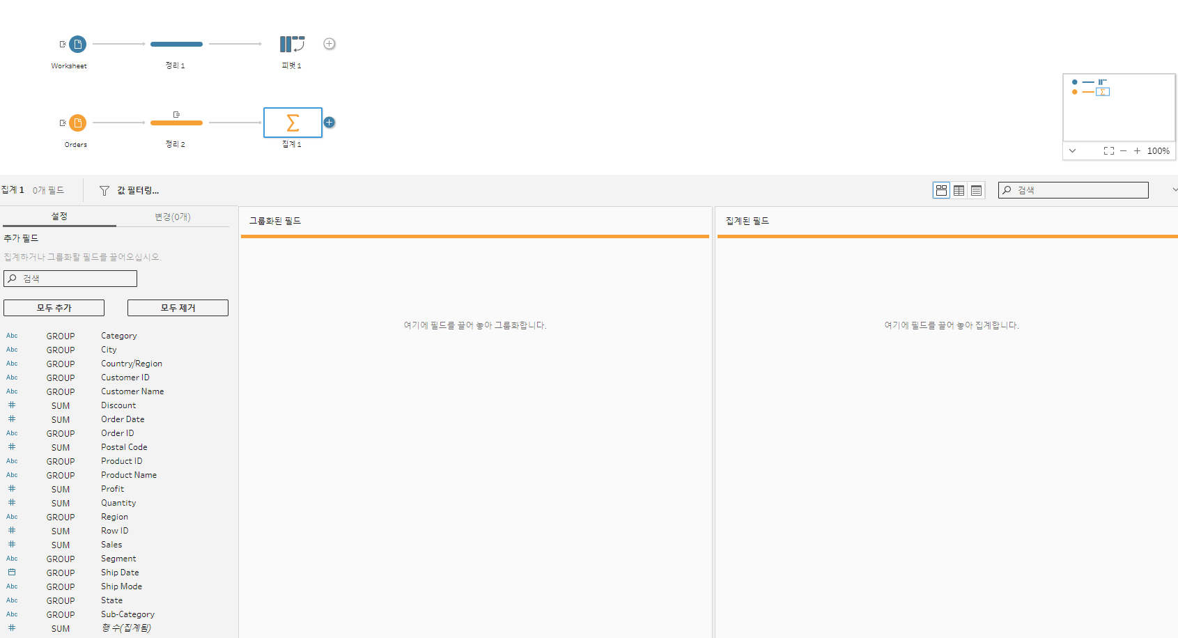 이렇게 집계를 할 수 있는 환경이 셋팅된다. 환경 구조는 왼쪽에 집계할 수 있는 필드들이 나열되어있고 왼쪽에서는 그룹화를 진행할 수 있으며, 오른쪽에서는 sum이나 count등 집계를 할 수 있는 탭이 나타난다.