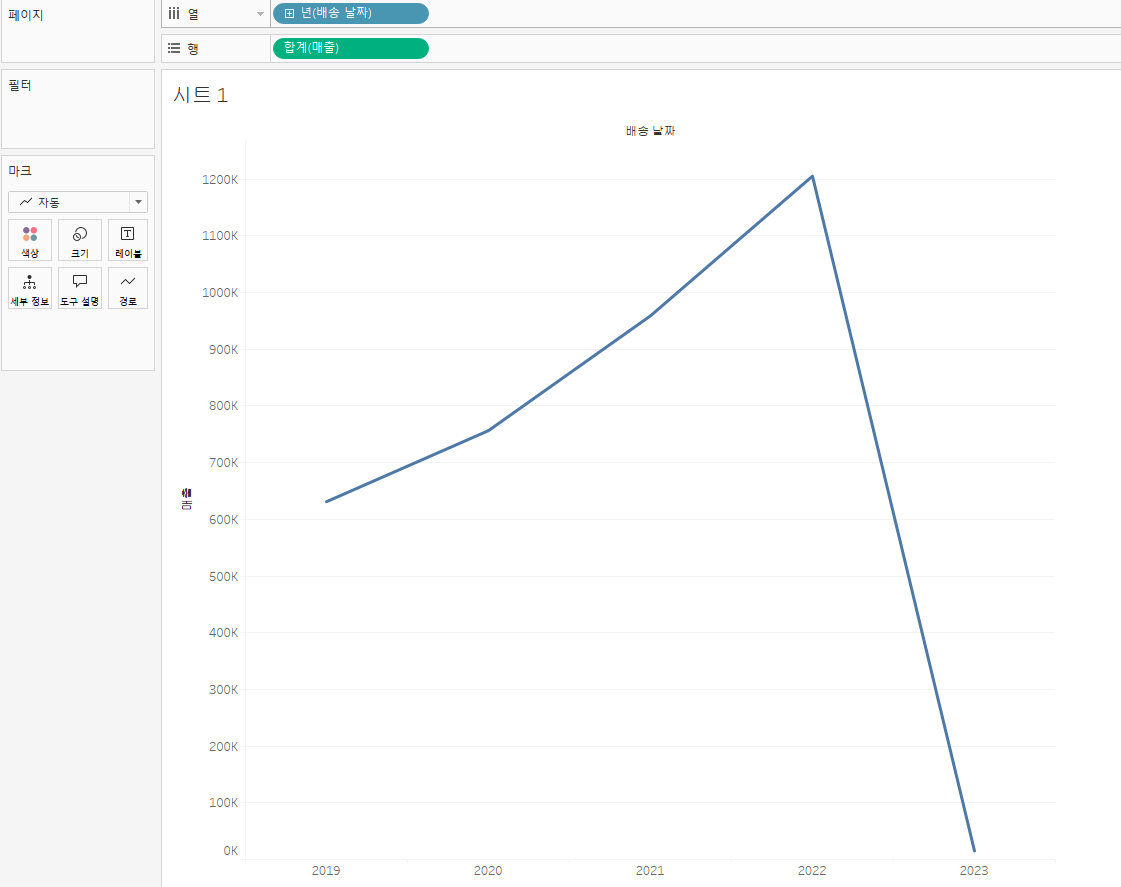 지금까지 수집된 데이터를 년도와 월로 확인하고싶어, 월의 계층만 남기고 상위계층을 지운상황이다. 이 그래프는 보기에는 문제가 없어보이지만, 해당 년도의 월별매출이 아니라 날짜로 기록되어있는 년도의 모든 1월매출의 합산, 2월매출의 합산으로 표시된 결과이다. 이런 문제는 날짜데이터가 연속적인 날짜데이터가 아니라 1월, 2월처럼 하나의 범주값으로 구분되기때문인데, 이런 문제를 해결하기 위해서는 1월부터 2월까지의 개념을 가지는 연속적인 데이터로 변경해주어야한다.