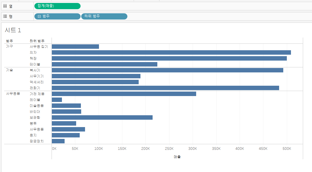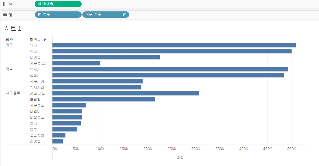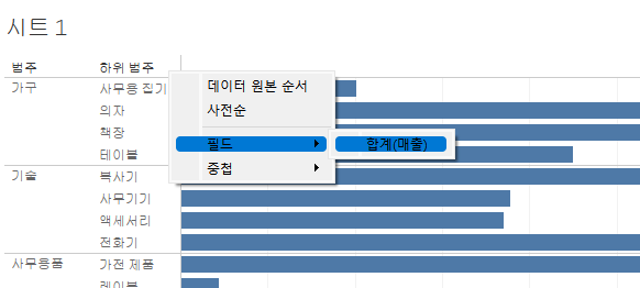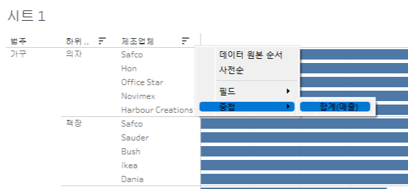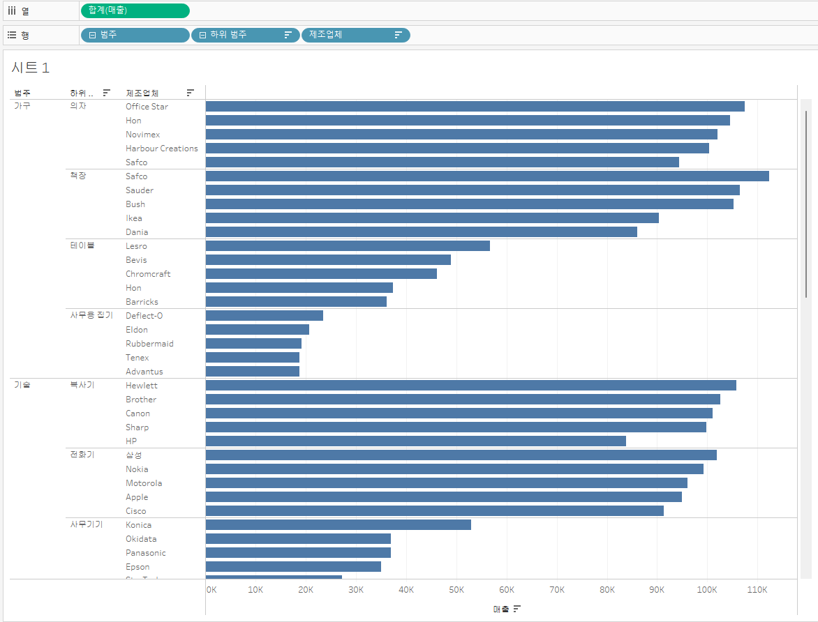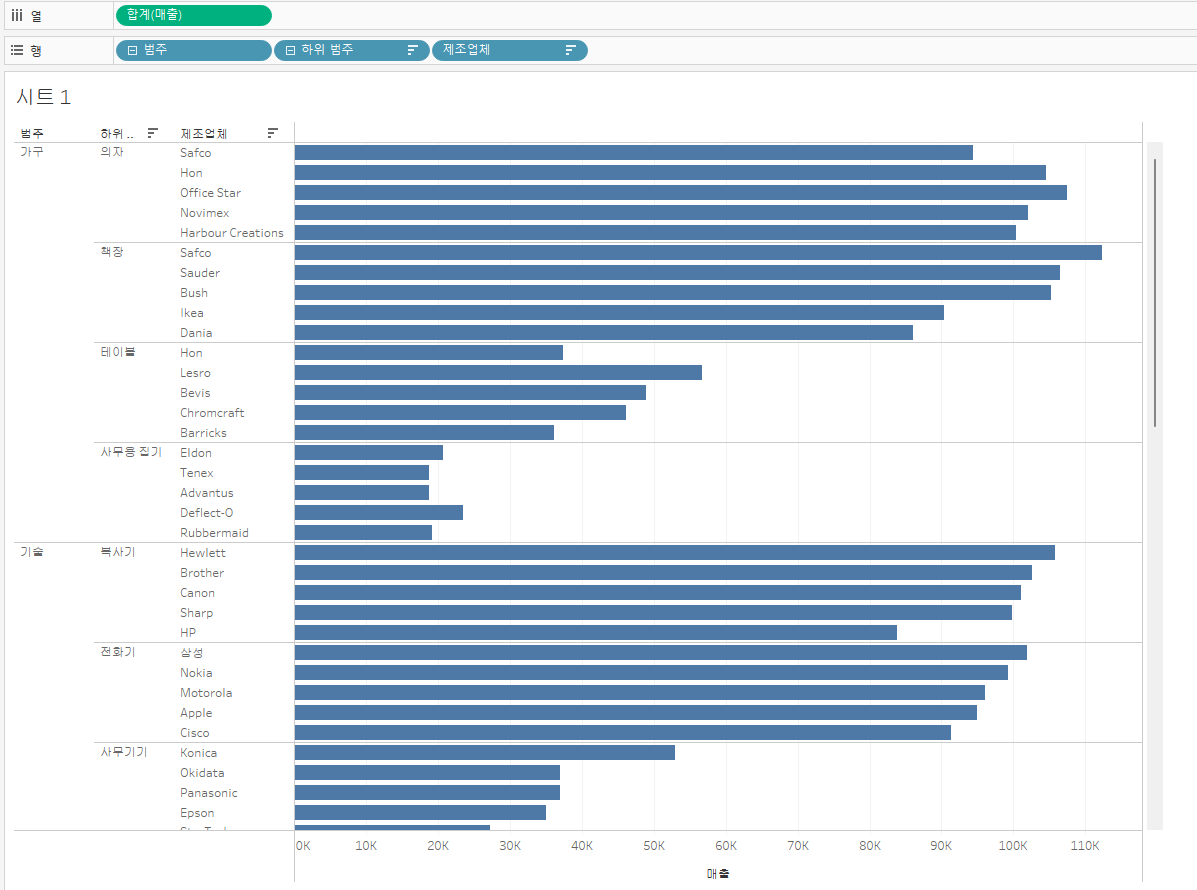 하지만 필드의 정렬을 합계로 다시 설정해도 판매량이 높은 순서대로 정렬되지않는다. 그 이유는 태블로 자제에서 범주, 하위범주, 제조업체이렇게 한꺼번에 데이터를 인식하는것이 아니라, 제조업체 자체만을 인식하기때문에 제조업 자체에서 판매량이 가장 높은 safco업체가 가장 첫번째로 정렬되는 것이다. 이걸 범주화로 묶어 정렬하고 싶다면