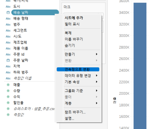 먼저, 시트에서 데이터 필드를 제거한 후, 연속형데이터로 변환한 뒤에 다시 계층으로 로드하면 된다.