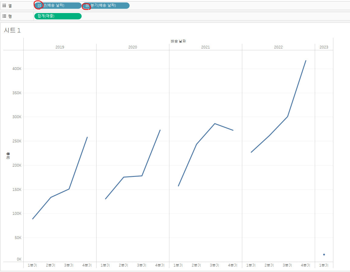 자동계층사용법은 계층화 하고싶은 필드 왼쪽부분의 +버튼을 눌러 원하는 계층을 선택하면 된다. 이렇게 해당 년도의 분기별 데이터를 확인할 수도 있고