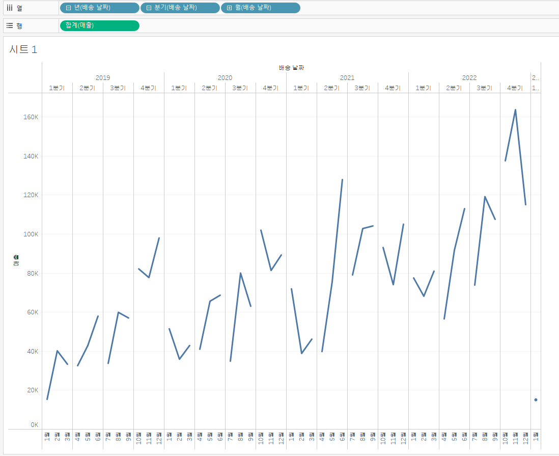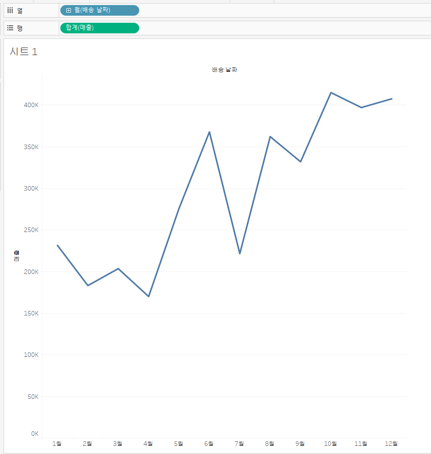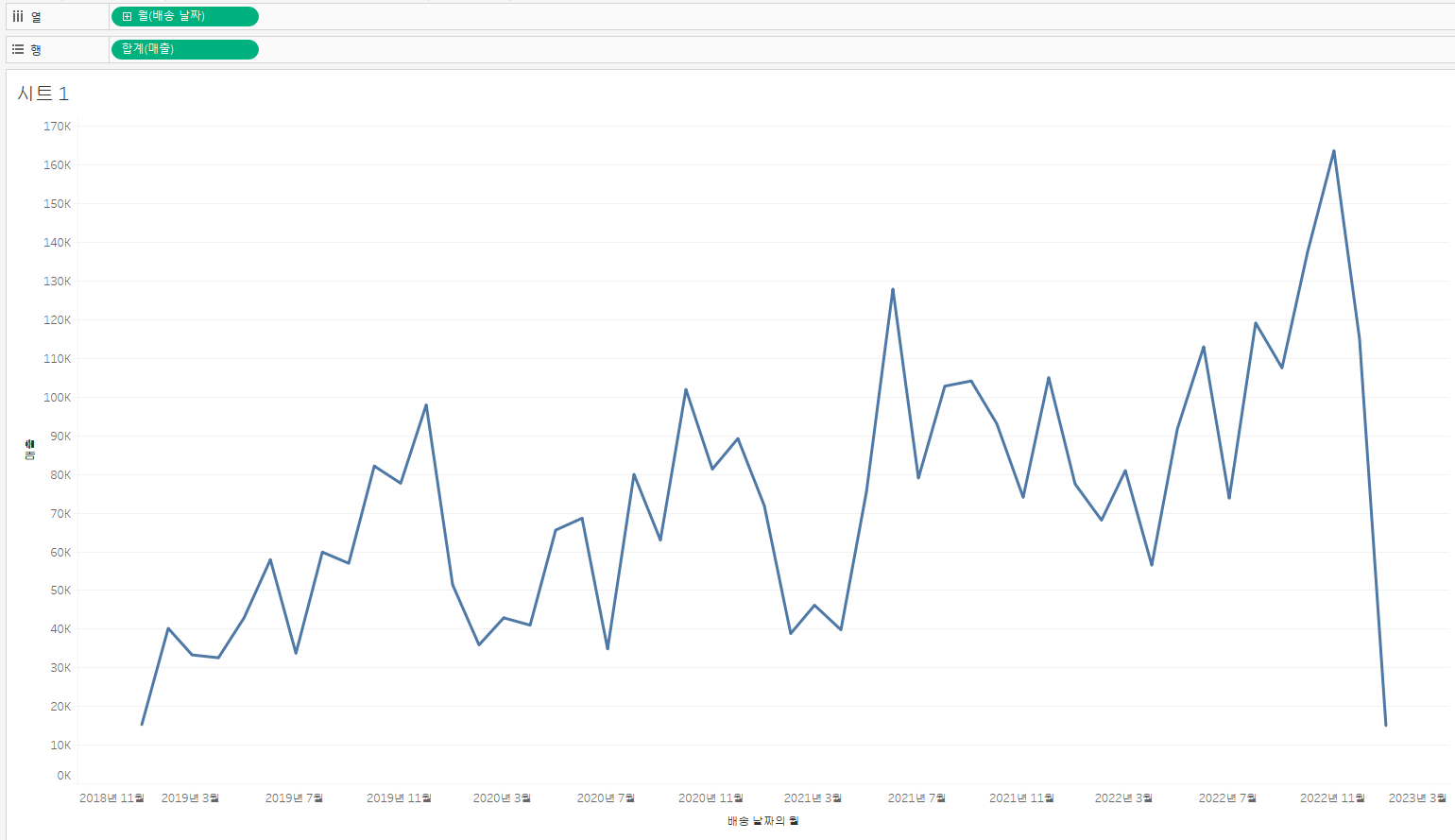 연속형으로 바꾸면 필드역시 숫자형태를 의미하는 초록색의 형태를 띄게되며, 다시 계층을 월까지의 하위범주로 로드해주면 원하는 형태의 그래프를 확인할 수 있다.