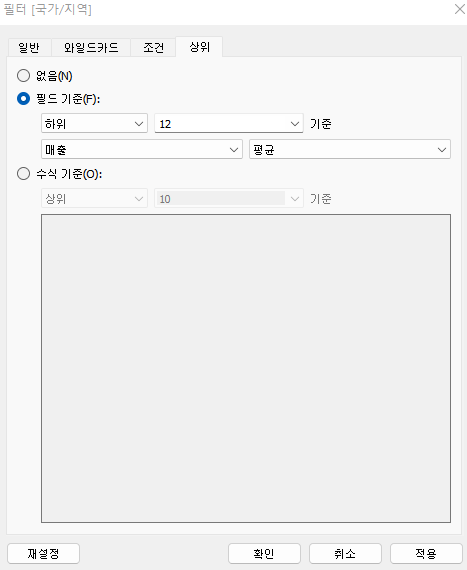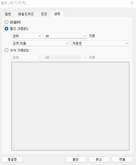 상위는 특정 필드에서 가져올 상위 n개의 값, 하위 n개의 값을 지정하여 가져올 수 있는 필터이다.