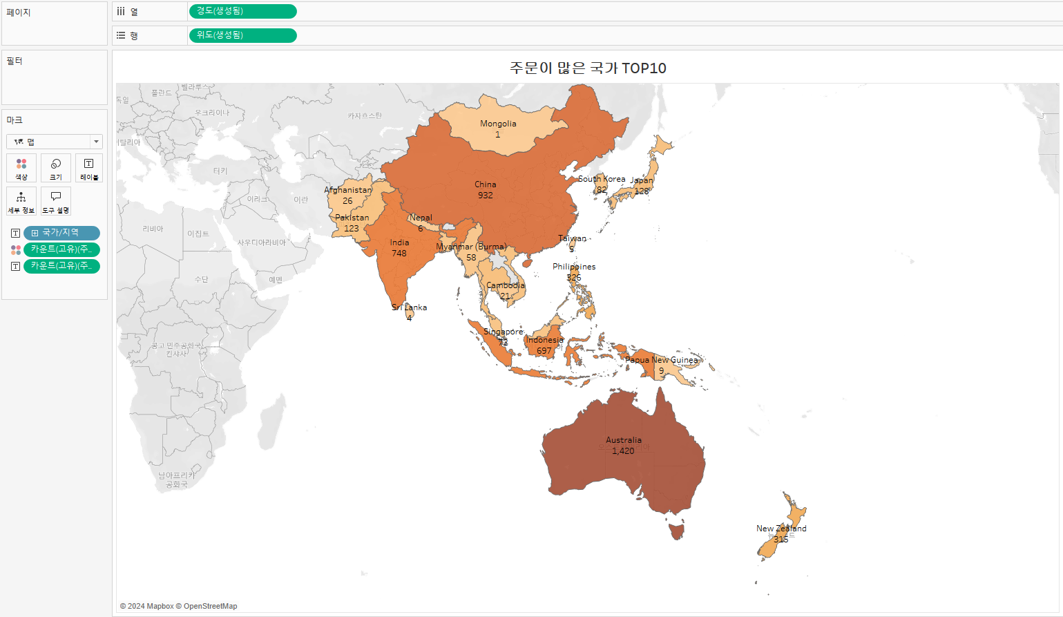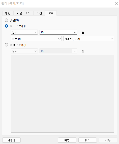 오늘 데이터 시각화의 목적은 주문이 재일많은 국가 상위10개를 추출하는것이므로 주문ID값을 고유카운트로 해서 10개로 지정해 필터를 적용해준다.