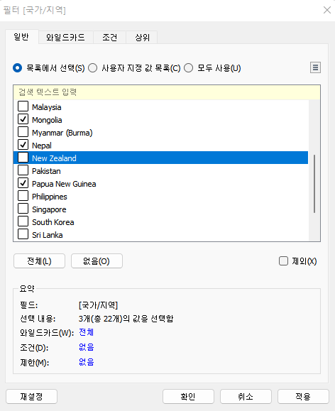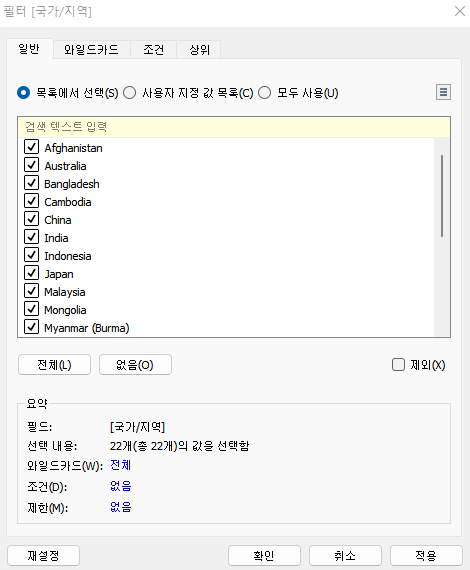 일반필터는 내가 직접 목록에서 추가하거나 제외할 필드를 선택하여 직접 필터를 거는 것을 말한다. 전체를 누르면 필드의 전체가 체크되고, 없음을 클릭하면 전체 체크된걸 없앨 수 있다.