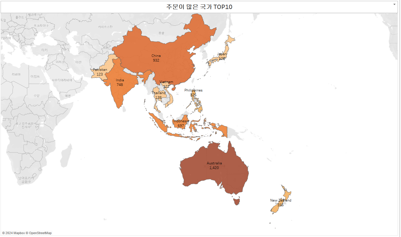 필터를 설정하면 필터의 설정대로 주문이 많은 상위10개의 국가가 출력된것을 알 수 있다.