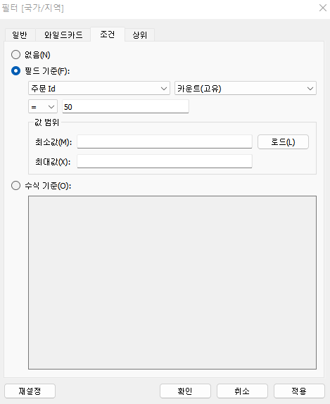 조건은 이름 그대로 데이터값에 조건을 걸어, 그 조건에 대해 데이터가 참일경우에만 출력하는 것이다. 조건을 사용할때 주의할점은 일반카운트와 고유값카운트가 있는데, 어떤걸 선택하느냐에따라 조건에 걸리는 값도 달라져서 데이터의 출력결과가 완전히 달라지므로 이부분을 주의해야한다.