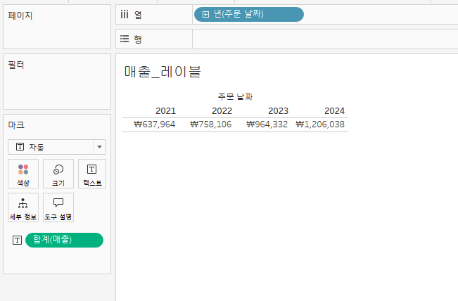 먼저 매출을 나타낼 레이블을 생성했다. 년도와 매출필드를 사용하여 해당 년도별 매출의 합계가 나타나도록 표시했다.