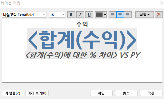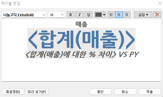 그후 레이블 편집에서 가장 중요한 정보인 매출합계가 가장눈에띄도록 색상과 크기를 변경해주었고, 전년도와의 비교를 알리기위해 레이블의 문구를 수정해주었다.